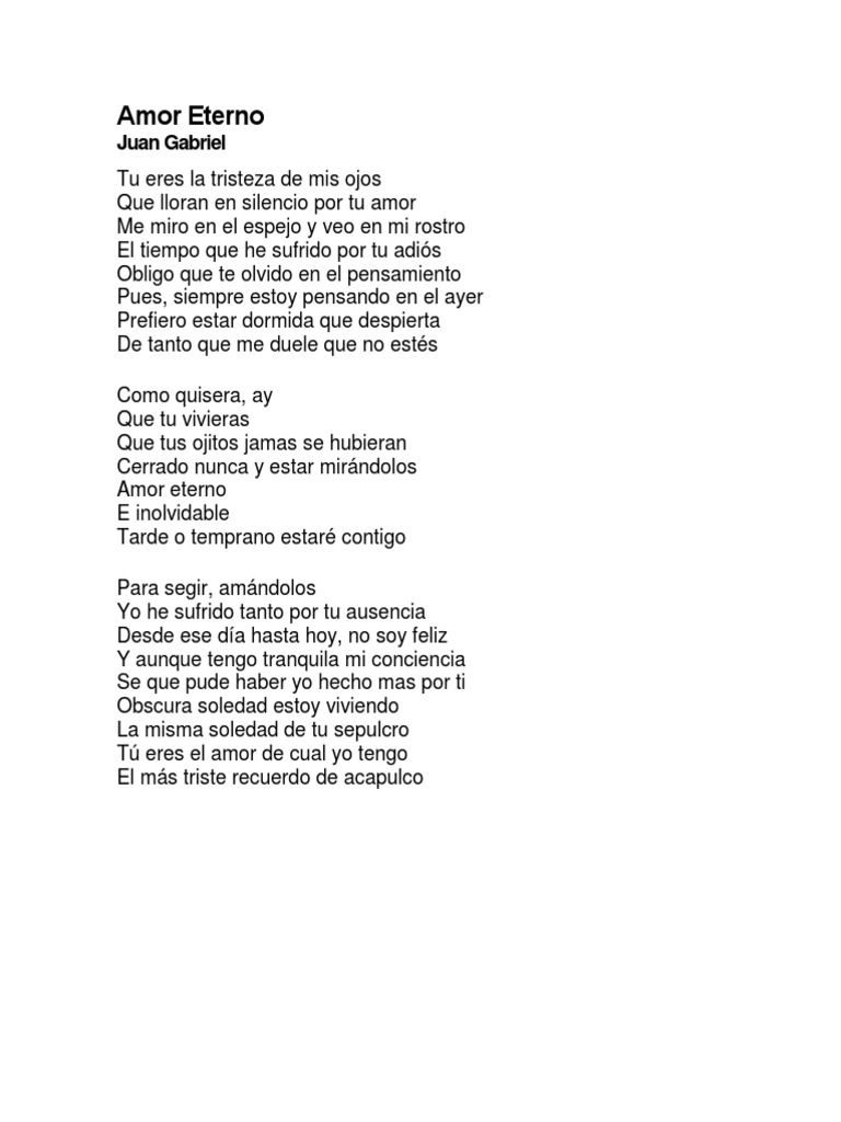 Yo he sufrido tanto por tu ausencia, desde se da hasta hoy, no soy feliz. Que lloran en silencio por tu adiós. Tarde o temprano estar contigo para seguir amándonos. Amor eterno, es una letra y música preciosa, que yo recordando a mi querido y añorado abuelo paterno, ángel arias vázquez, fallecido siendo yo una niña de corta edad, me pareció aunque no diese el tono, cantarla en su recuerdo. Tãƒâº eres la tristeza de mis ojos, que lloran en silencio por tu amor. Me miro en el espejo y veo en mi rostro el tiempo que he sufrido por amor eterno, e inolvidable. Tú eres la tristeza de mis ojos, que lloran en silencio por tu amor. Amor eterno letra de juan gabriel en letrita.com el mejor sitio de letras de canciones. Tu eres la tristeza de mis ojos que lloran en silencio por tu amor me miro, en el espejo veo en mi r. Letras de amor eterno por juan gabriel. Tu eres la tristeza de mis ojos que lloran en silencio por tu adiós me miro en. Tarde o temprano estar contigo para seguir amandonos. Oscura soledad estoy viviendo, la misma soledad de tu sepulcro.